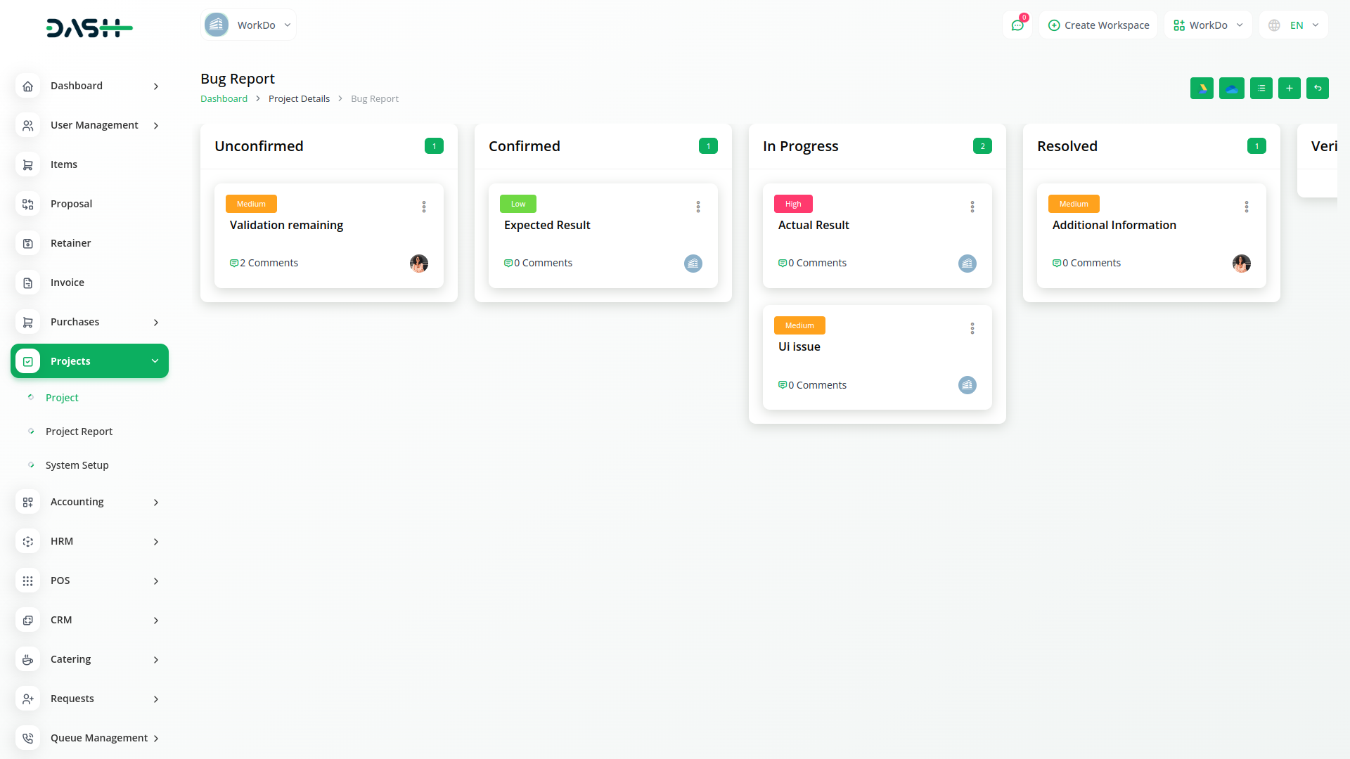 Create new bugs and assign users and priorities to them. You can write a note in the text box for the bug description. Also, the status of each bug can be changed through a simple drop-down and Kanban drag system.
